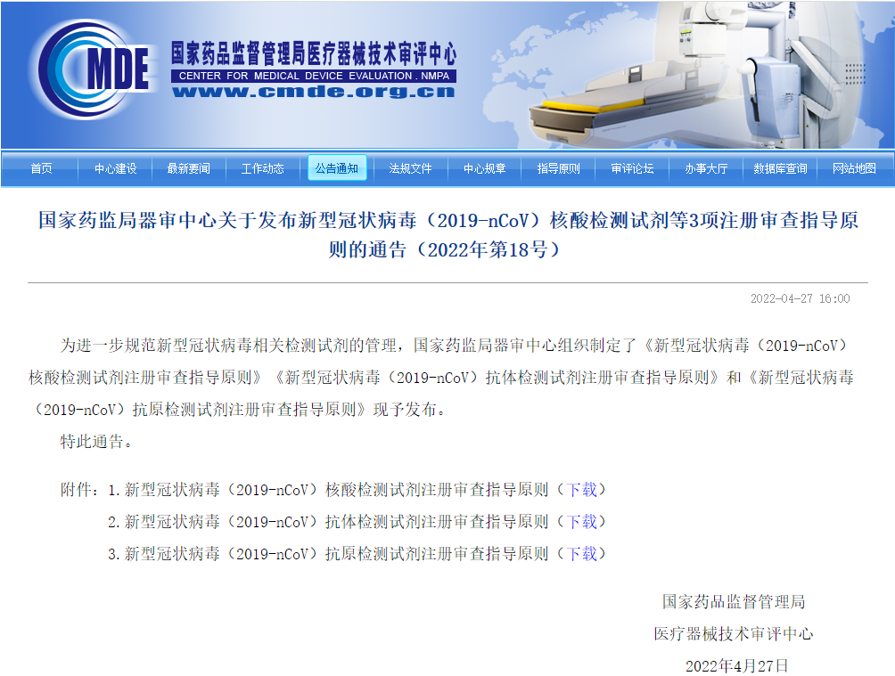 刚刚!国家药监局器审中心发布《关于发布新型冠状病毒(2019-nCoV)核酸检测试剂等3项注册审查指导原则的通告(2022年第18号)》。
